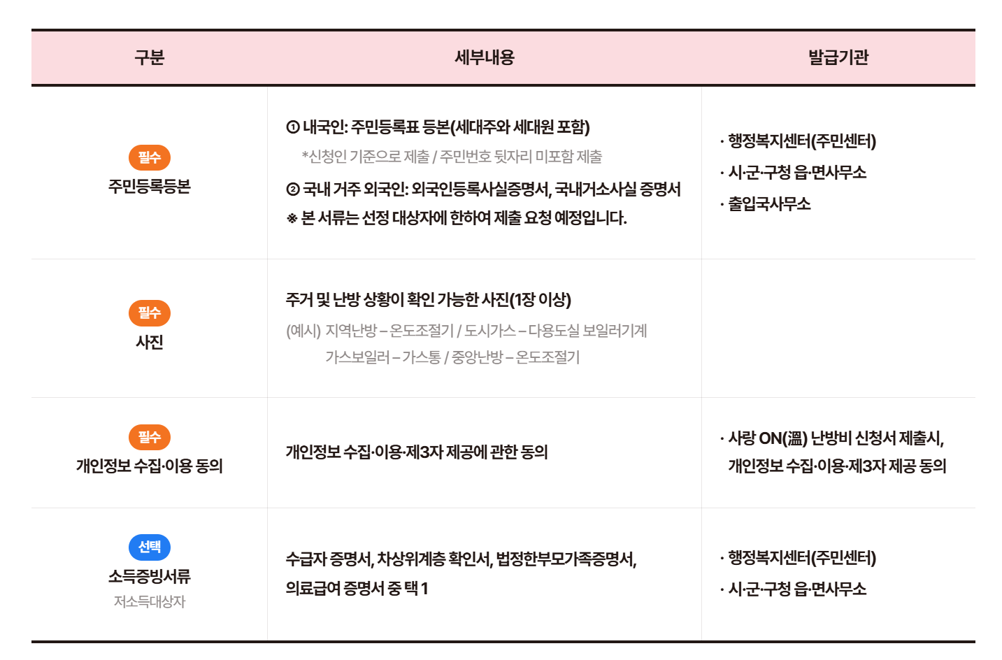• 수급자증명서, 차상위계층 확인서, 공과금 미납 고지서 등