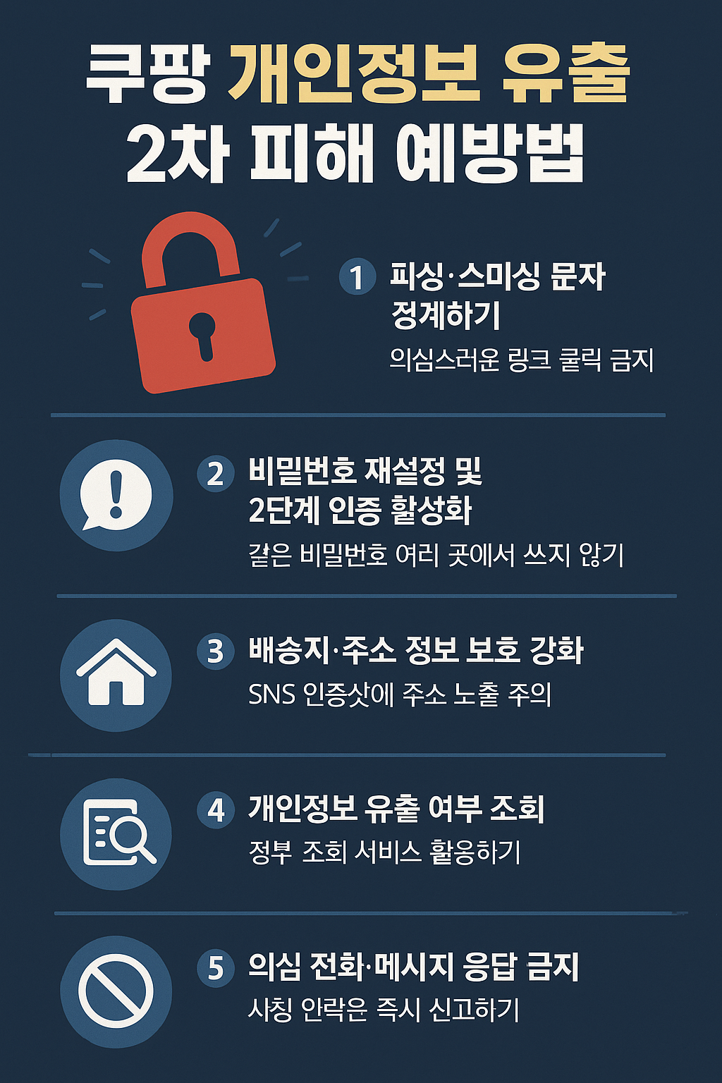 - 쿠팡, 네이버, 카카오, 은행, 카드사 등 주요 계정의 비밀번호를 모두 변경합니다.