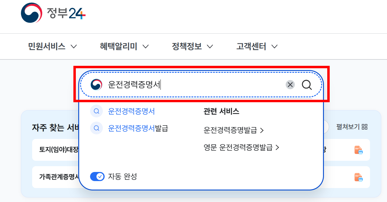 2️⃣ 검색창에 ‘운전경력증명서’ 입력