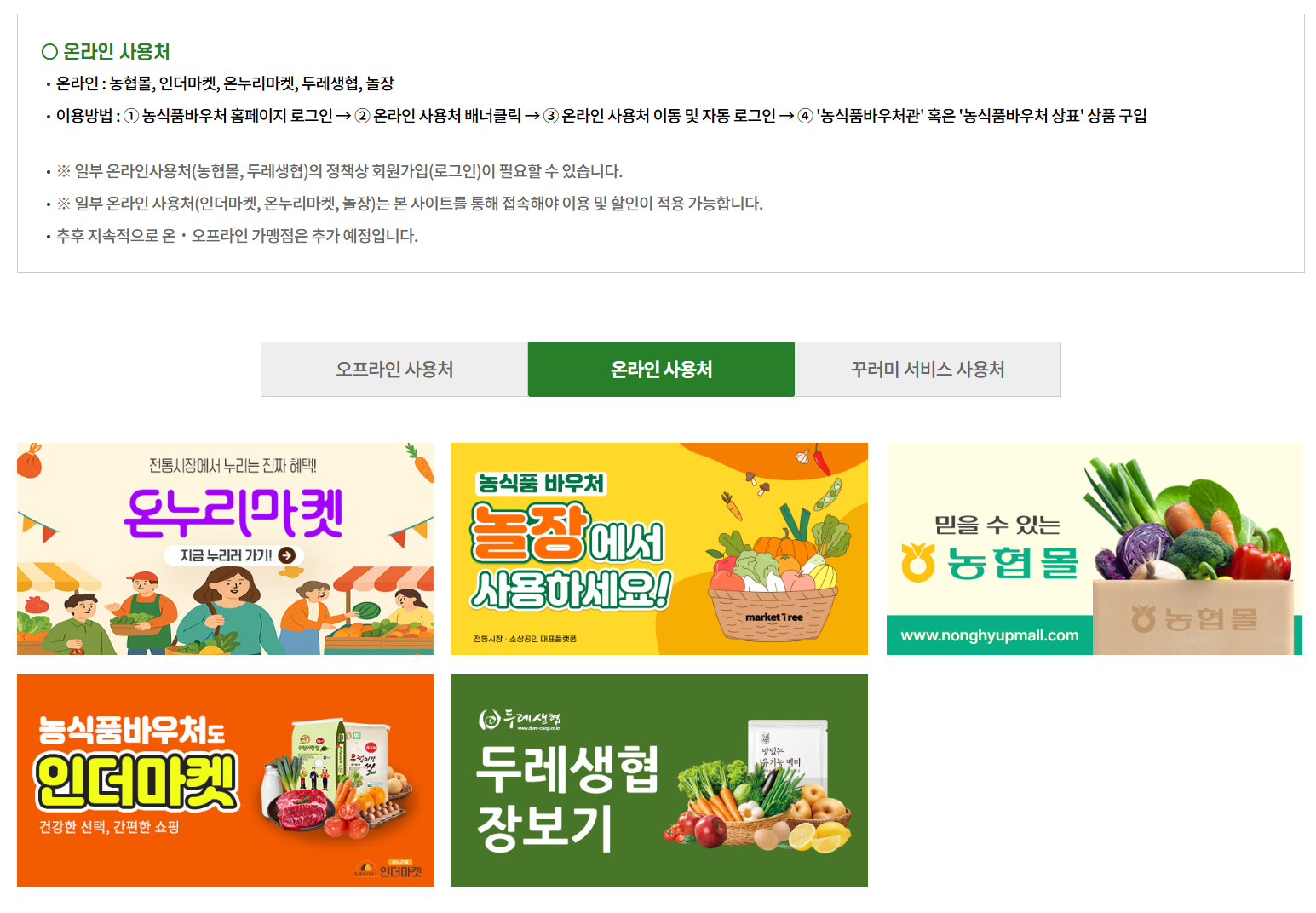 | 온라인몰 | 농협몰, 마켓컬리, 우체국쇼핑 | 카드 결제 가능 |