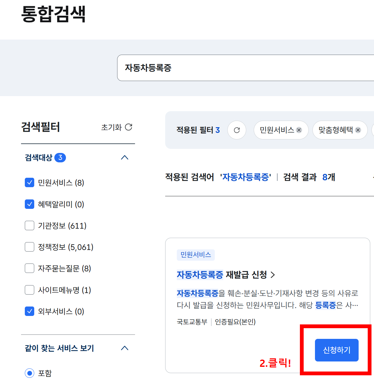 2. '민원서비스' > '자동차등록증 재발급 신청하기' 클릭!