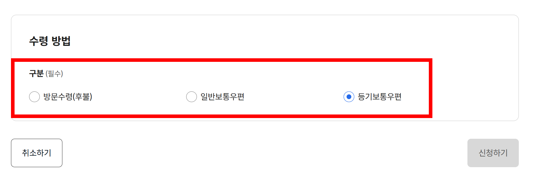 4. 수령방법 선택 (방문수령, 일반보통우편, 등기보통우편 중 선택)
