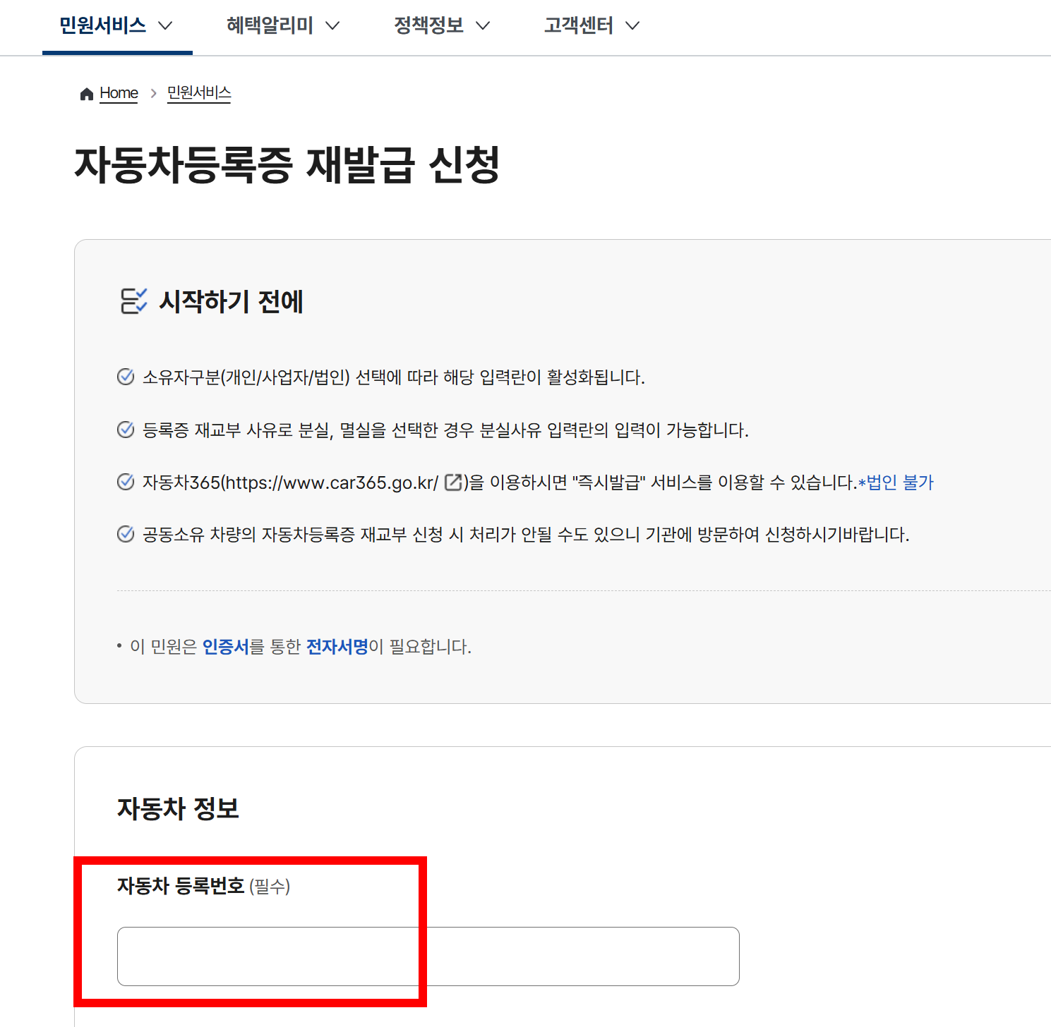 2. '민원서비스' > '자동차등록증 재발급 신청하기' 클릭!