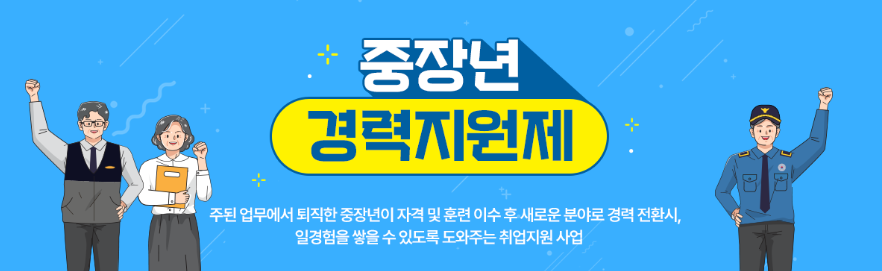 중장년 경력지원제는 고용노동부가 주관하고 한국고용정보원·중장년일자리희망센터 등 관련 기관이 운영하는 중장년층 재취업 지원 프로그램입니다. 중장년내일센터 및 훈련기관을 통해 자격 취득 또는 훈련 이수 후 경력 전환을 희망하는 50세~65세 미취업자들을 지원합니다.